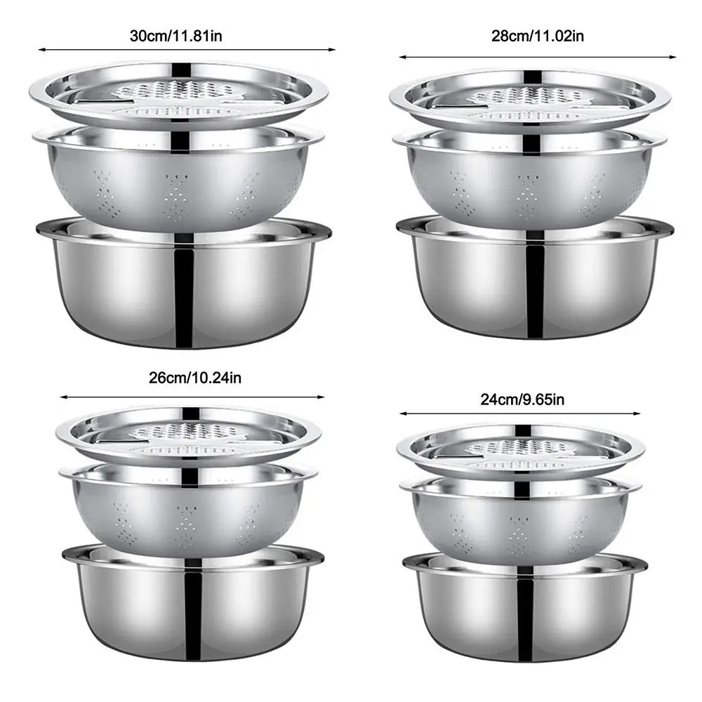 Size: 24/26/28/30cm(9.45/10.24/11.02/11.81in) Package Include: 3Pcs/Set Drain Wash Vegetables Basin with Grater Cover